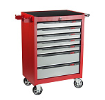 С 7 ящиками. Округлая форма бортовой ручки тележки. Корпус тележки оснащен защитными бортами, что сводит к минимуму риск повреждения оборудования и нанесение травм автомеханикам во время перемещения по СТО. Выдвижные ящики оснащены нескользящими вкладками. В комплекте предусмотрен верхний коврик из EVA, предназначенный для удобного хранения различных мелких деталей. Роликовые направляющие с функцией автоматического возврата обеспечивают плавность открывания/закрывания ящиков. Максимально возможная нагрузка на тележку: 450 кг.