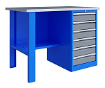 Однотумбовый. Допустимая нагрузка на столешницу 750 кг. Опорные элементы выполнены сварными из холоднокатаной стали. Верстак состоит из столешницы, опоры, тумбы P6 с шестью малыми ящиками и полки-стенки. Все металлические элементы покрыты полиэфирной порошковой краской. Столешница из фанеры марки ФСФ толщиной 24 мм, которая покрыта лаком-антисептиком и листом оцинкованной холоднокатаной стали толщиной 1,2 мм. Размеры (ВхШхГ) 855x1196x696 мм.