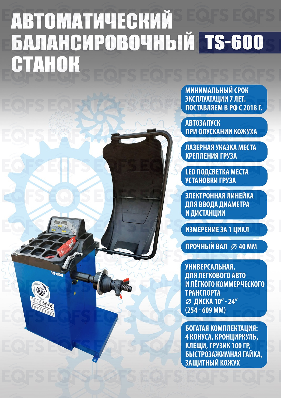 TS-600 Автоматический балансировочный станок. Автоматический ввод дистанции и диаметра диска. Остановка и фиксация колеса в месте установки грузика. Лазерная указка места установки грузика на 6 часов. Старт опусканием кожуха или с кнопки. Для колес легковых автомобилей, мотоциклов и легких грузовиков с диаметром диска с резиной до 800 мм. Размеры диска: ширина 3–10” (76-254 мм), диаметр диска 10–24” (254÷609 мм). Вал- 40мм. Гарантия 18 мес – наш монтаж, 12 мес – самостоятельная установка. В комплекте: кожух с автозапуском + клещи + кронциркуль + быстрозажимная гайка + набор конусов.