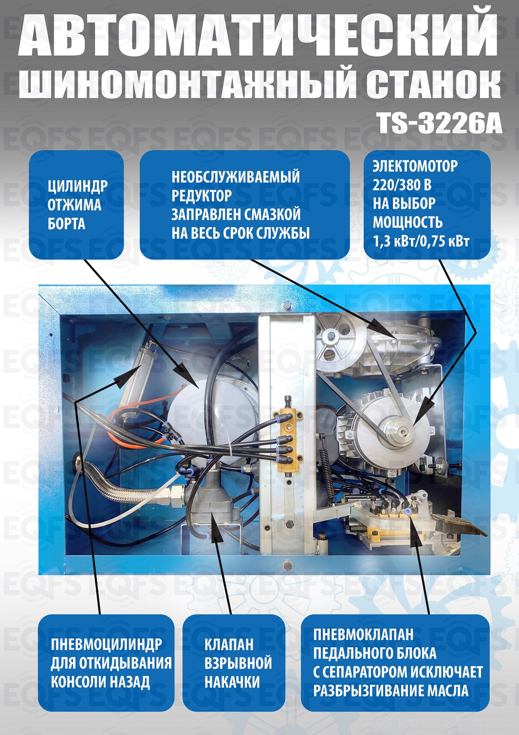 Автоматического шиномонтажного стенда TS-3226А предназначен для монтажа и демонтажа шин легковых автомобилей, внедорожников и легких грузовиков с размером колес от 11-24 дюйма. Усилие пневмоцилиндра в 2500 кг. В комплекте: полноценная 3-я рука для работы с жесткой и низкопрофильной резиной RUNFLAT. + встроенный бустер 24 литра (взрывная подкачка) + пистолет для подкачки шин + монтажка + регулятор давления с влагоотделителем и манометром. Напряжение шиномонтажных станков 220В или 380В на выбор. Гарантия 18 мес – наш монтаж, 12 мес – самостоятельная установка.