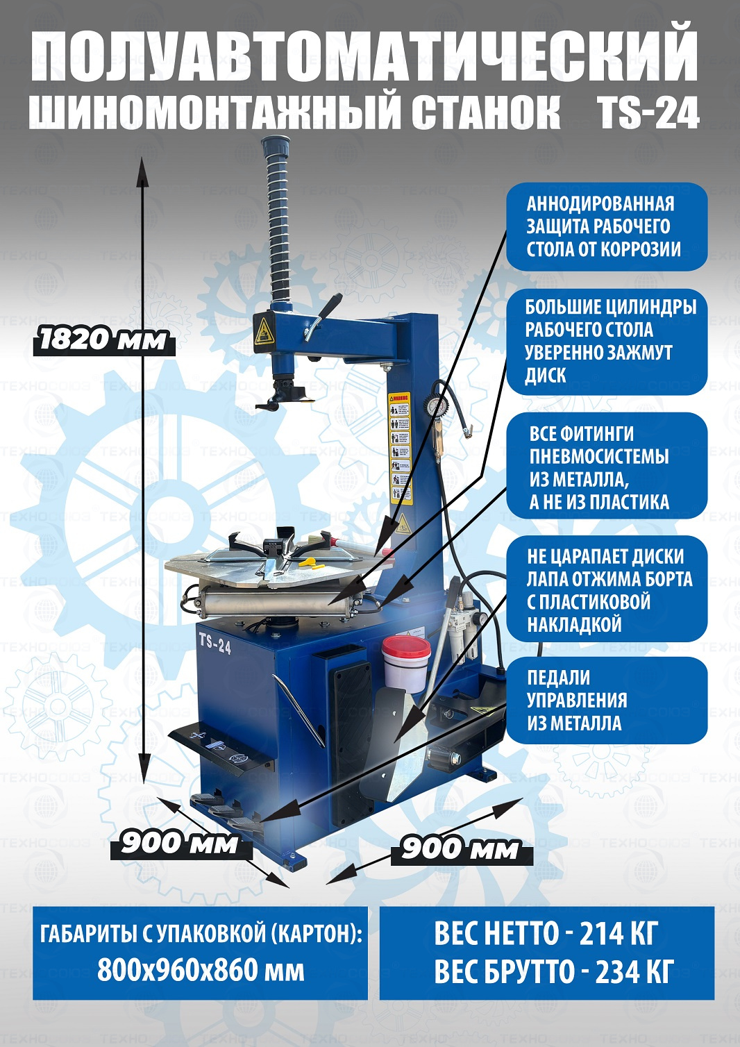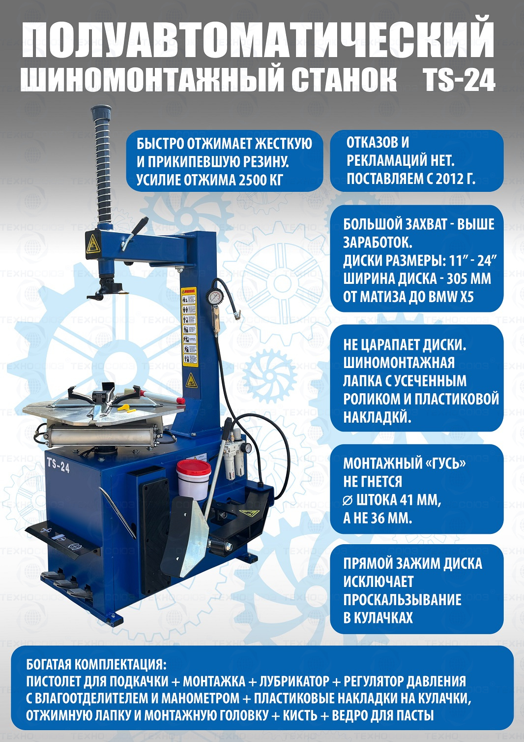 Шиномонтажного станка TS-24. Полуавтоматический. Квадратный стол. Рекомендуется для постов со средней и высокой проходимостью. Для дисков: внешний 11÷21”, внутренний 12÷24”.  Усилие отрыва покрышки 2700 кг. В комплекте: пистолет для подкачки шин + монтажка + пластиковые накладки на зажимные кулачки + регулятор давления с влагоотделителем и манометром. Напряжение шиномонтажных станков 220В или 380В на выбор.